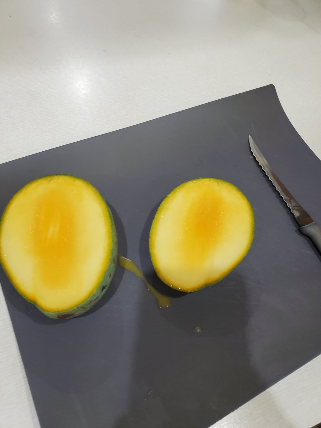 Unfortunately, this tree flowers profusely but has had trouble consistently setting fruit. Also, this mango is a challenge to pick and if allowed to ripen on the tree will not reach it's flavor and texture potential. If the mango gives off a pineapple-like smell or changes to a lighter shade of green, pick it.