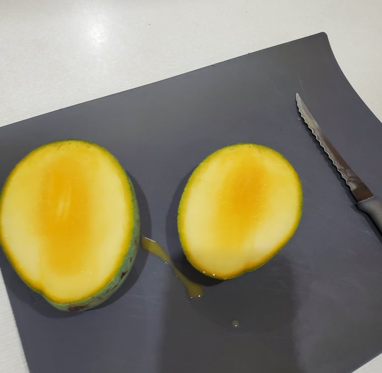 One of the finest eating mangos. It's juicy pale flesh can taste like a sweet Hawaiian Sugarloaf pineapple or can taste like sweet coconut.